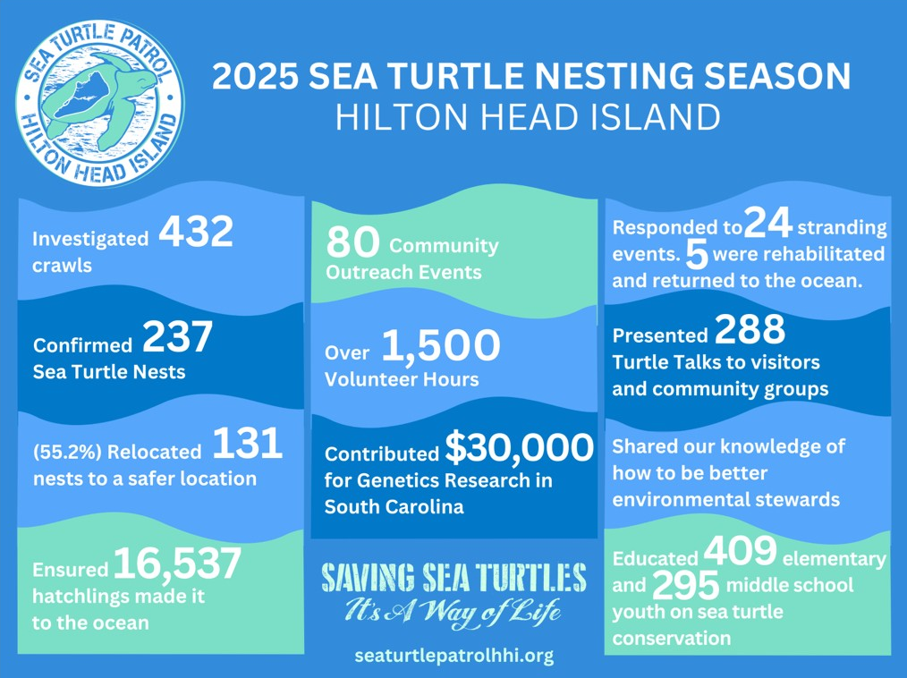 Sea Turtle Patrol Hilton Head Island plays an important role in helping turtles during nesting season. On average, a sea turtle lays 120 eggs in a nest two to eight times over a nesting season, and Sea Turtle Patrol HHI marks and monitors these nests on morning patrols.