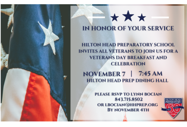 Hilton Head Preparatory School invites all Veterans to join us for a Veterans Day Breakfast and Celebration on November 7 at 7:45 AM. The event will take place in the Hilton Head Prep Dining Hall. Breakfast will be served, guests will hear from a variety of speakers, and enjoy musical numbers from our students. Please RSVP to Lynn Bocian at 843-715-8502 or [email protected] by November 4th.